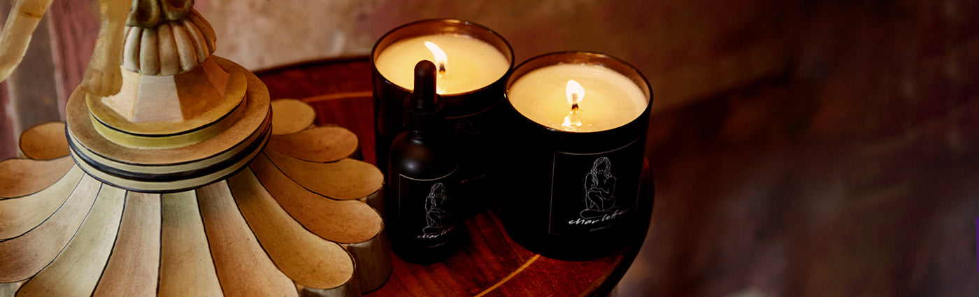 Set the mood wherever you are. Explore our custom collection of luxury scented candles and premium blended body oils. Indulge your skin and your senses.